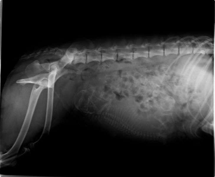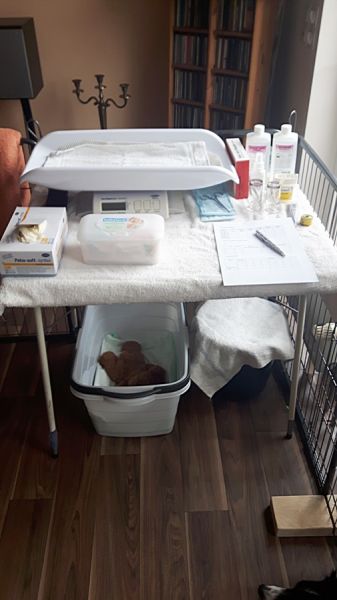 2.20 erster Welpe, keine Nachgeburt.Danach Ruhe. Nur noch ab und zu leichte Wehen. Nach Rücksprache Aufbruch Klinik Echt Untersuchung. Welpe fühlbar, Wehenspritze 7.49 2. Welpe 8.27 3. Welpe, Heimfahrt 9.30 Uhr Abgang fehlende Nachgeburt |